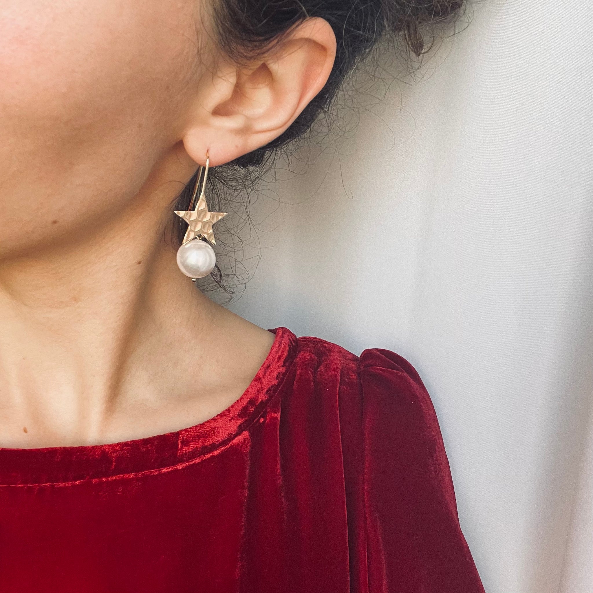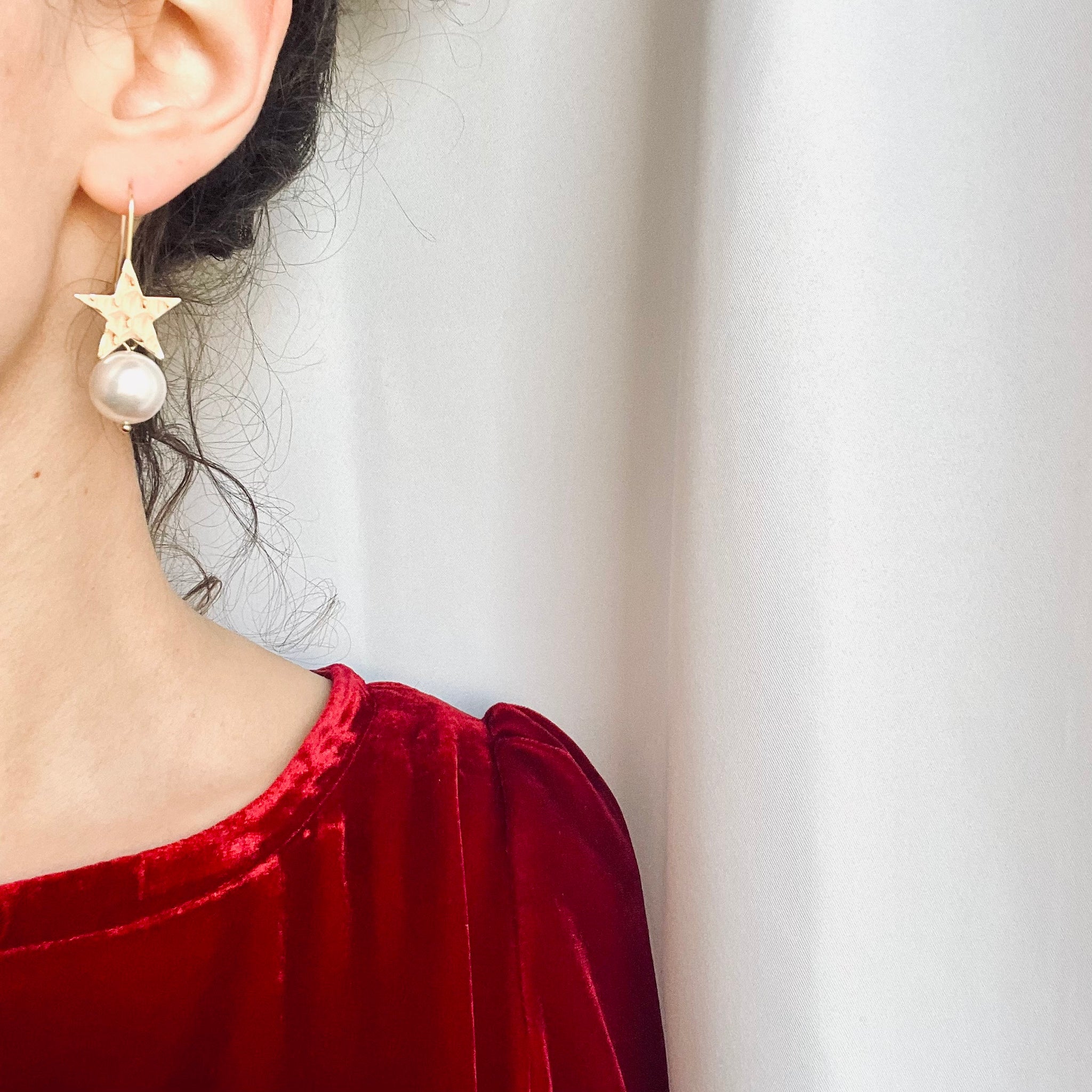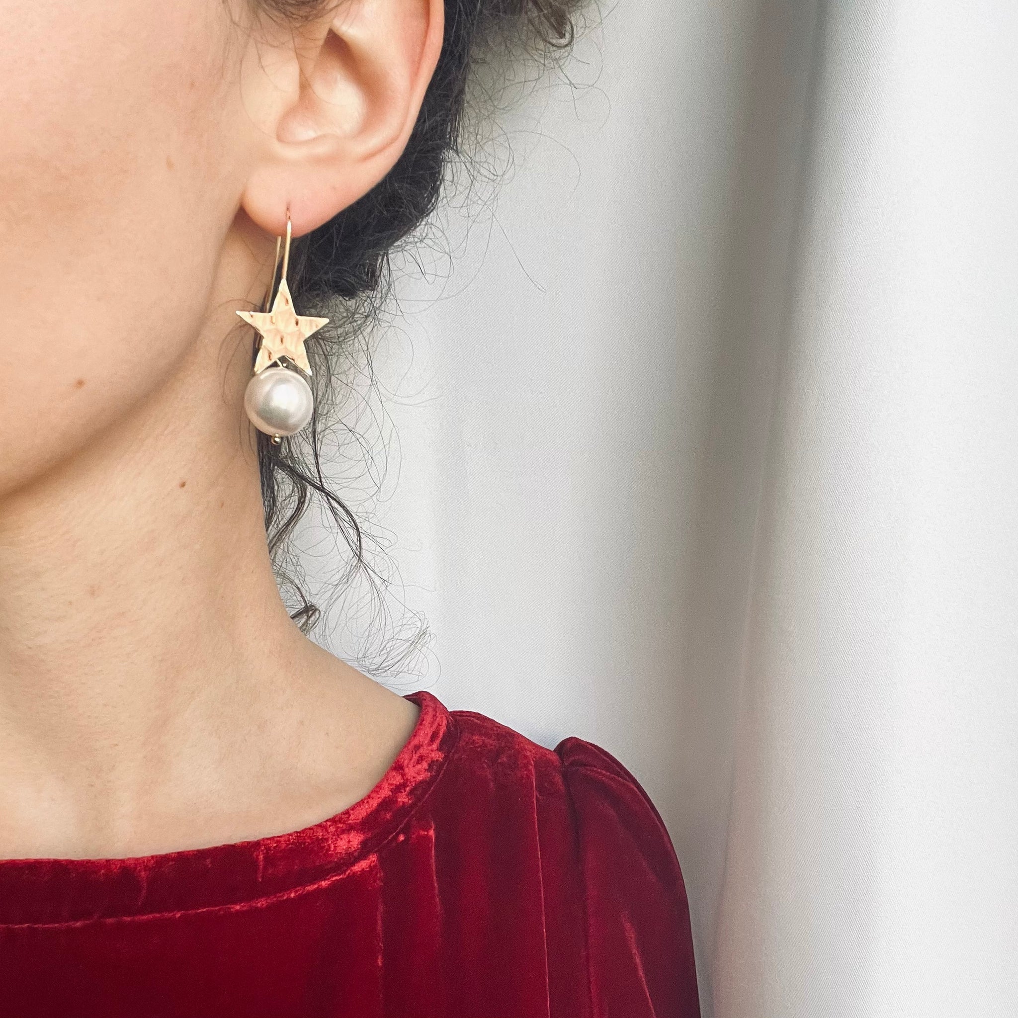 Questi orecchini pendenti uniscono la magia delle stelle alla purezza delle perle: una stella in ottone placcato oro 18k brilla con eleganza, mentre una grande perla naturale pende delicatamente sotto, creando un equilibrio perfetto tra luminosità e raffinatezza.